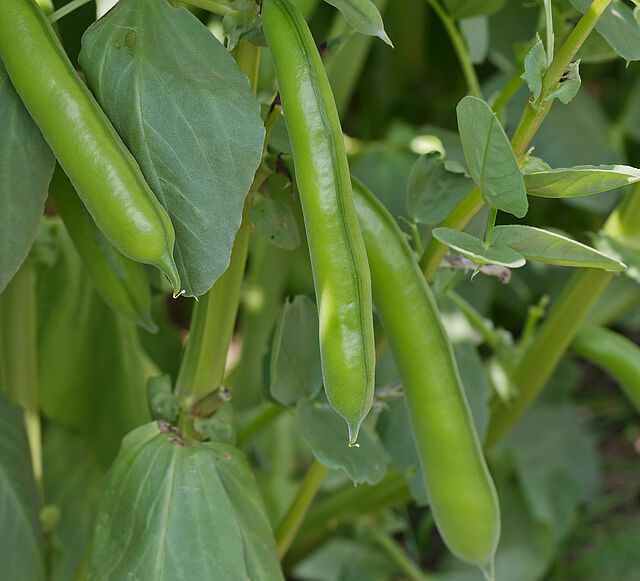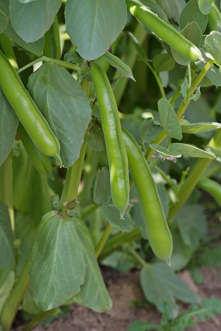 The Vicia faba grows some 0.5–1.8 m tall and is a firm plant with sturdy stems of a square cross-section. The broad beans are broad, leather like pods. They are green and usually mature to a blackish-brown with a densely downy skin. Nowadays, modern varieties specifically cultivated for food production have pods which are 15-25 cm long and 2-3 cm thick. Each bean pod contains some 3-8 seeds. These seeds are round or more oval shaped.