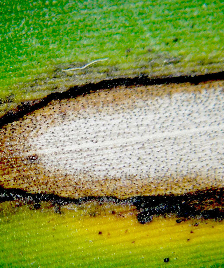 Black sigatoka (Mycosphaerella fijiensis) first causes small, light yellow spots or streaks on leaves of about one month old. The symptoms run parallel to the veins. Within a few days, the spots become a few centimetres in size and turn brown with light grey centres. These spots enlarge further and the tissue around the lesions turns yellow and dies. Lesions merge and the whole leaf turns brown and ultimately dies. In cases of severe infection leaves may die within a few weeks. Because of the lack of leaf tissues, fruit maturity is hampered.